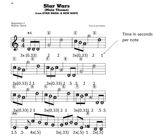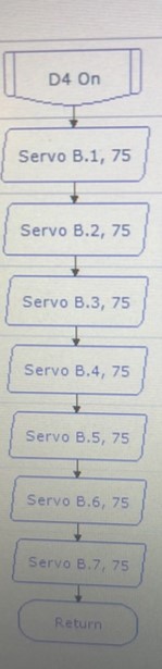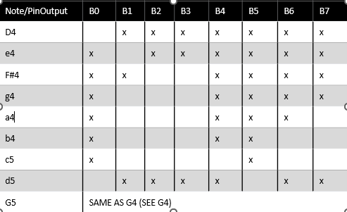 I decided it would be simplest to create subroutines to move each servo to the playing position and then another for the servo to move down to non playing position for each note. I can then use the wait command for the note to be played for the amount of time required.